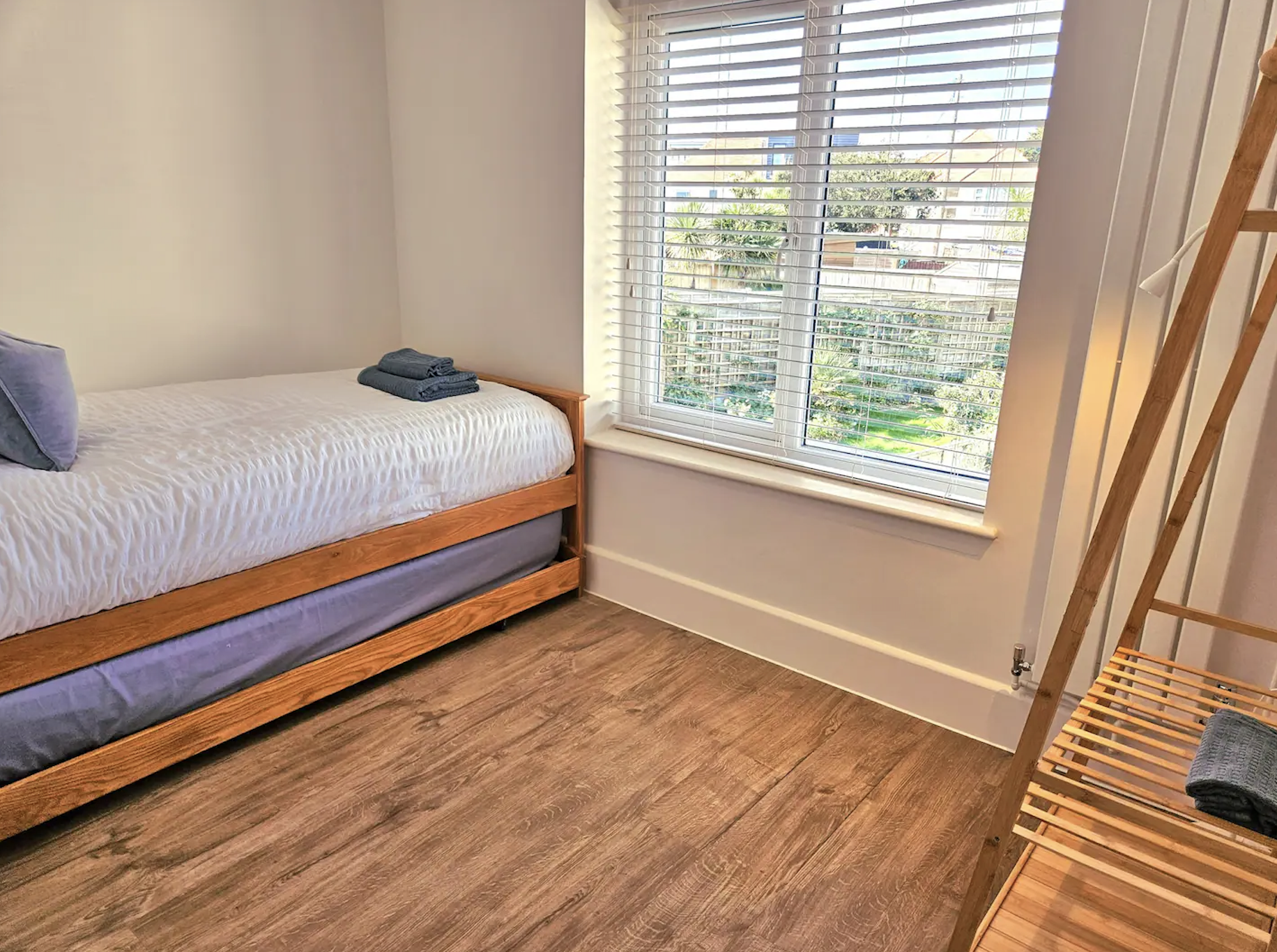 Two comfortable single beds with a view of the Mediterranean-style garden, and the option of pushing these together to make a double bed.